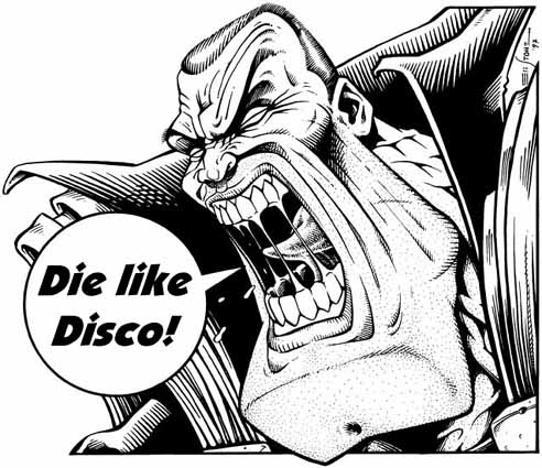 Helmutt YellingMeet Dick Helmutt. Not only is Dick a big jerk of a super-hero but he was also a personal project I was working on called I; Hero. I had his whole story planned out to the detail when I decided that I should abandon the idea. After a few minutes of self-analysis I realized that Dick Helmutt was just a reaction to feeling creatively stifled by The Tick's insipid cuteness. But how long could that feeling of back-lash propel me before I calmed down and got sick of doing this new, morosely dark character? Not long, I think. So I scrapped Dick. But I've got a lot of other ideas rapping on the backs of my eyeballs. Here are a few samples of non-Tick art I've done in recent days. item #107, (above illo) For Sale $75 (10"x8") |