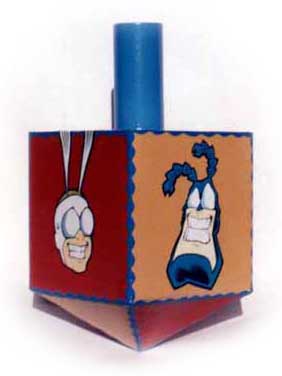 Dreidel No, I'm not Jewish--but Arthur is. Upon hearing that The Tick was getting his own special Christmas issue I thought it only fair to pay some attention to The Festival of Lights. I proposed a back-up story to my editor, he went for it, and thus was the birth of Jews Are Mighty: Arthur Teaches The Tick About Hanukkah. This is a photo of an actual dreidel that I built from cardboard. item #106, (Dreidel) |